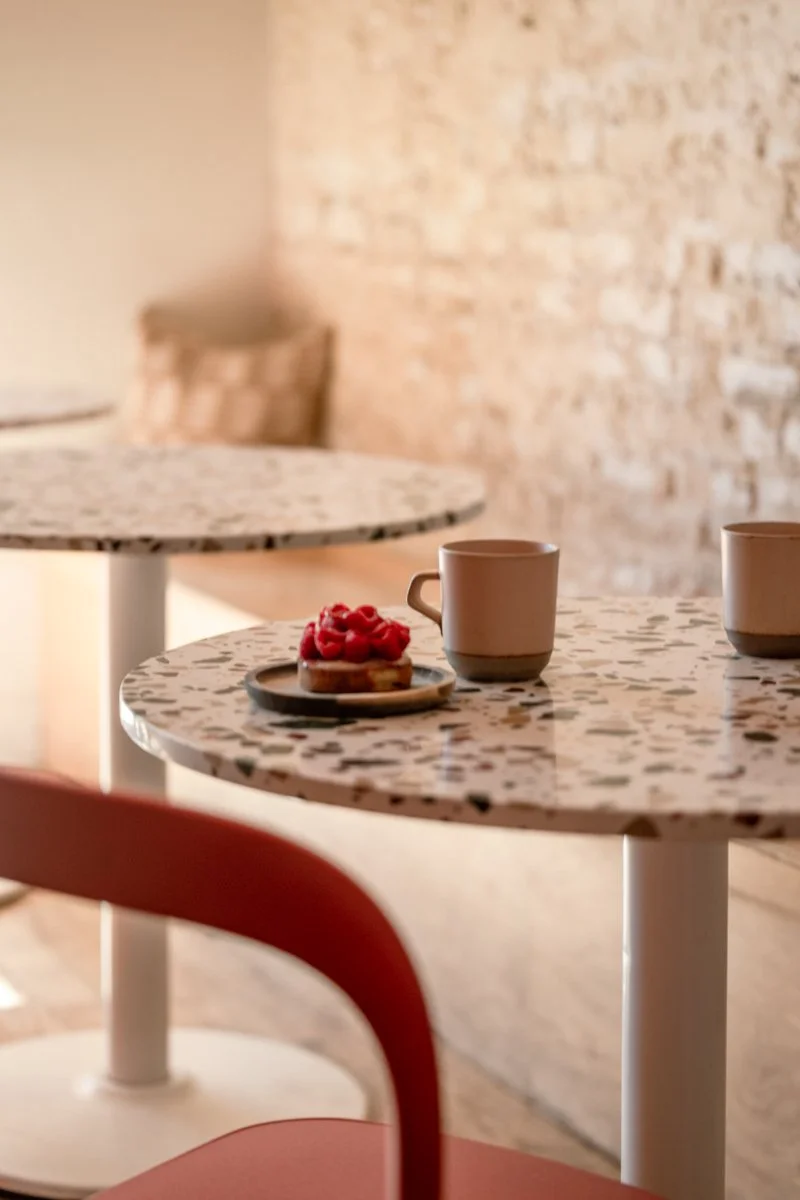 The interior design is characterized by a minimalist aesthetic with a focus on natural light and warm materials. The limewash walls create a sense of calm, while the pops of color from the pink espresso bar and terrazzo tables add a playful touch. The overall effect is a space that is both inviting and sophisticated, perfect for enjoying a cup of coffee and a moment of respite.