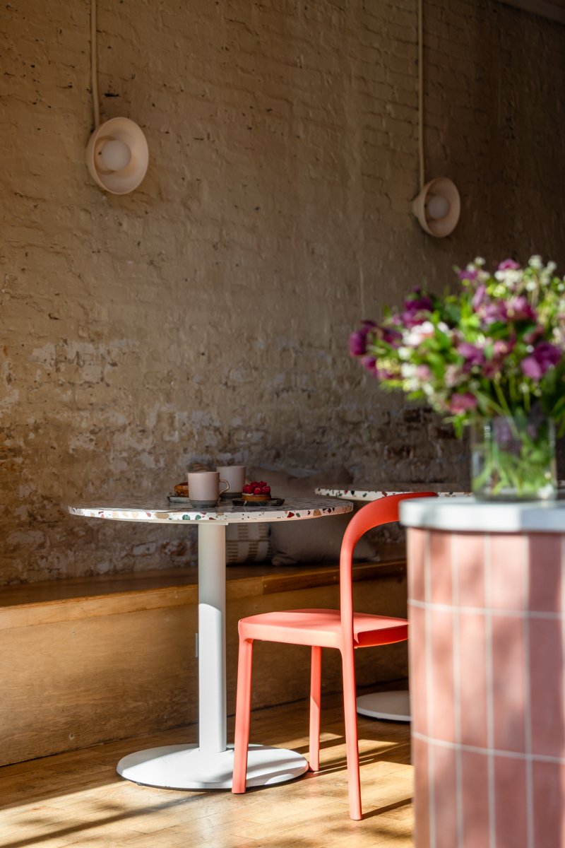 Local buzzy cafe radiates pink hues against a neutral palette