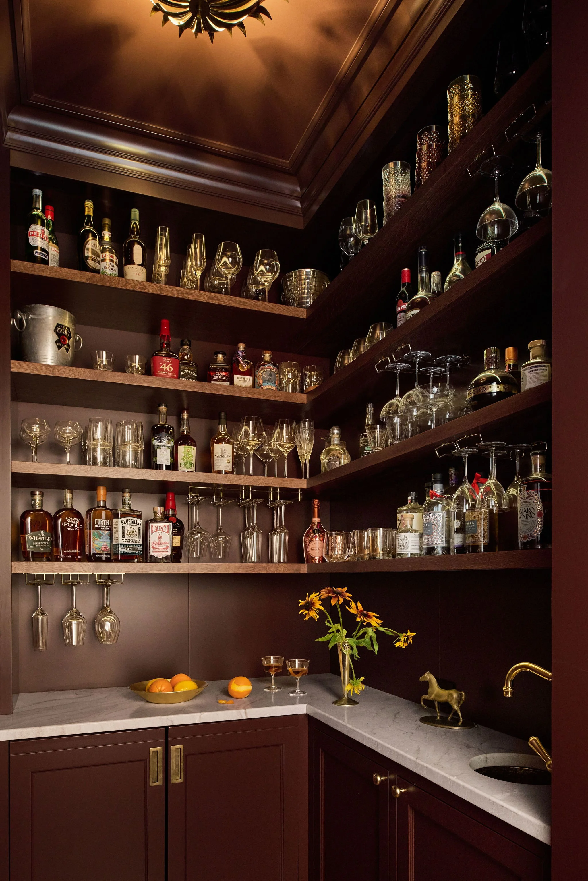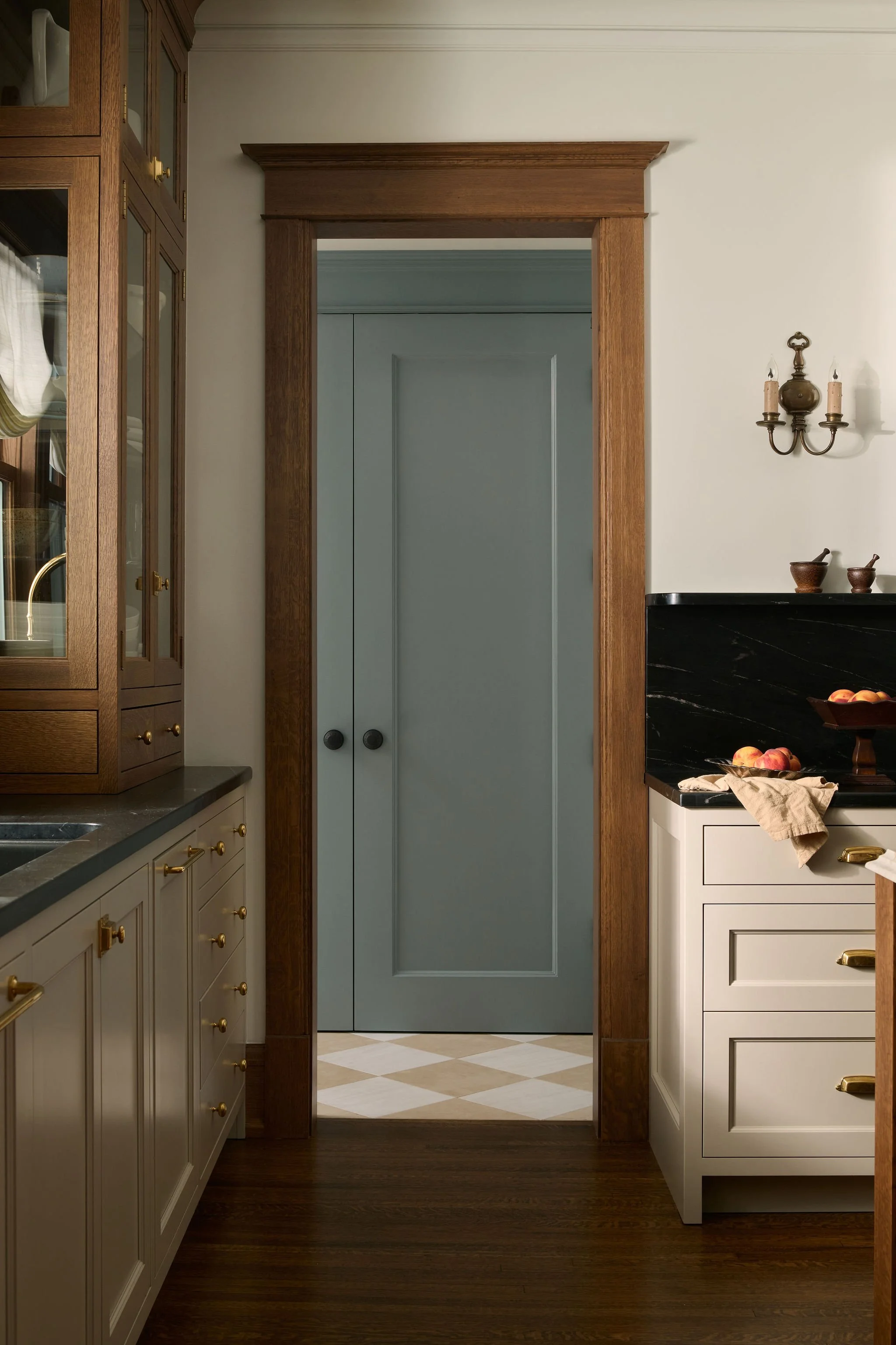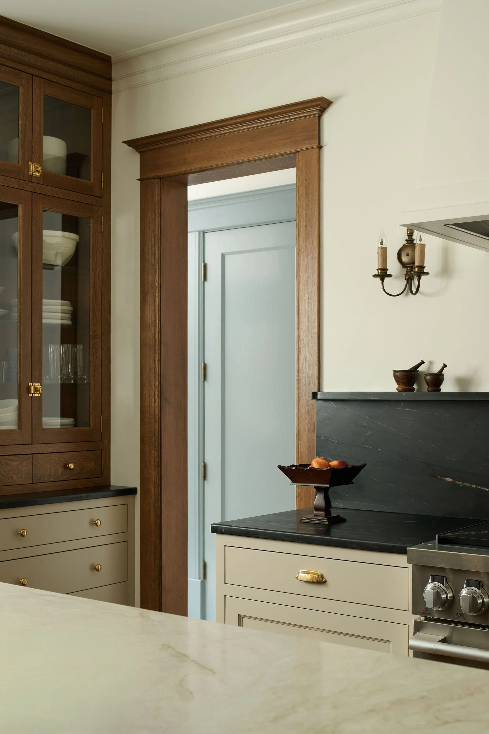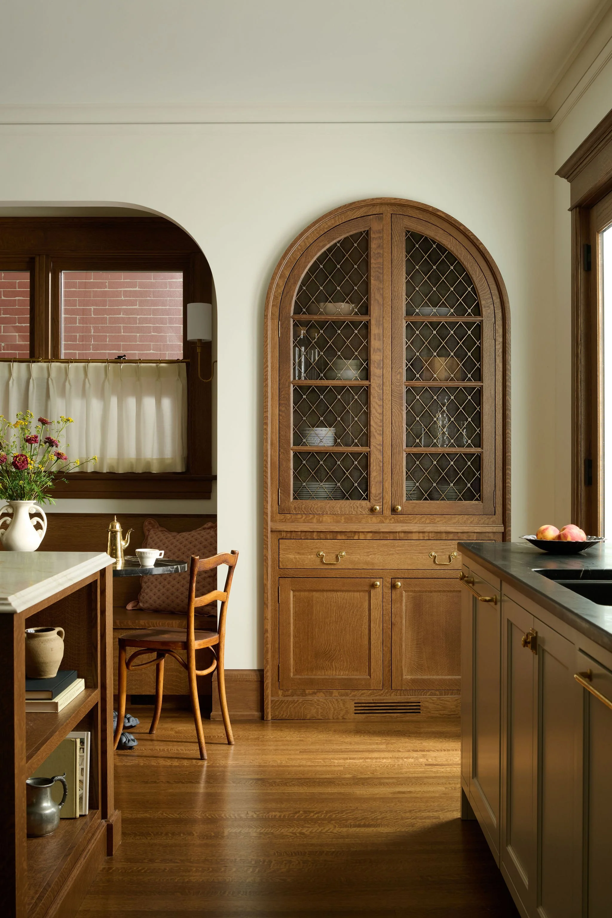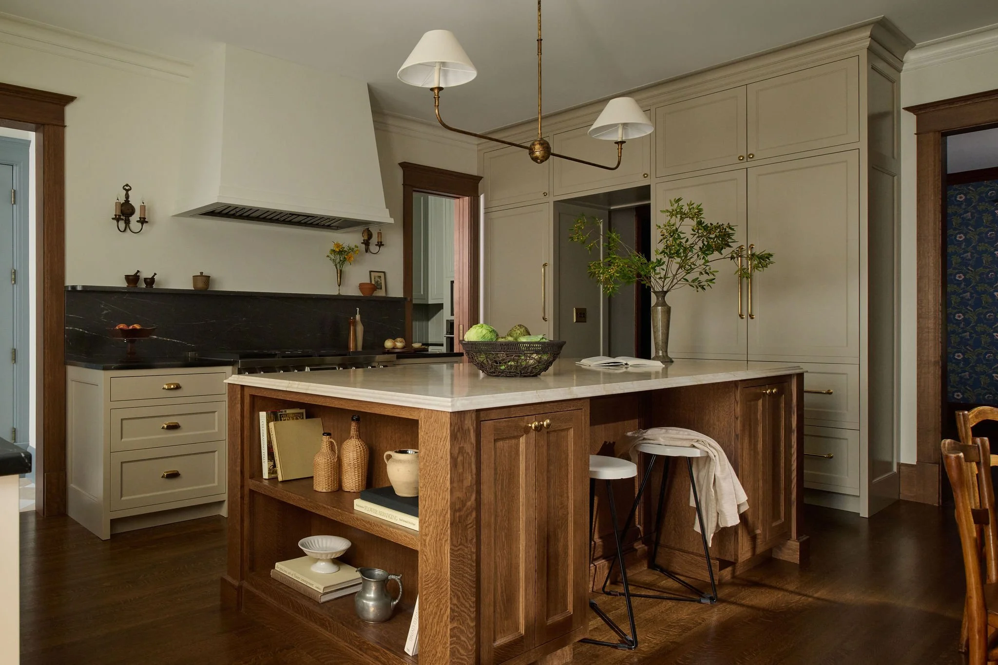 The aim of this project was to restore the original character of this home. A key focus was the kitchen, where a complete overhaul of the existing layout was undertaken. A new butler's pantry was strategically incorporated to enhance functionality and providing a space to tuck away kitchen clutter. The reimagined kitchen now revolves around a substantial wood island, offering ample prep space and a central gathering point. In the a hall a small closet was repurposed into a discreet secret bar.