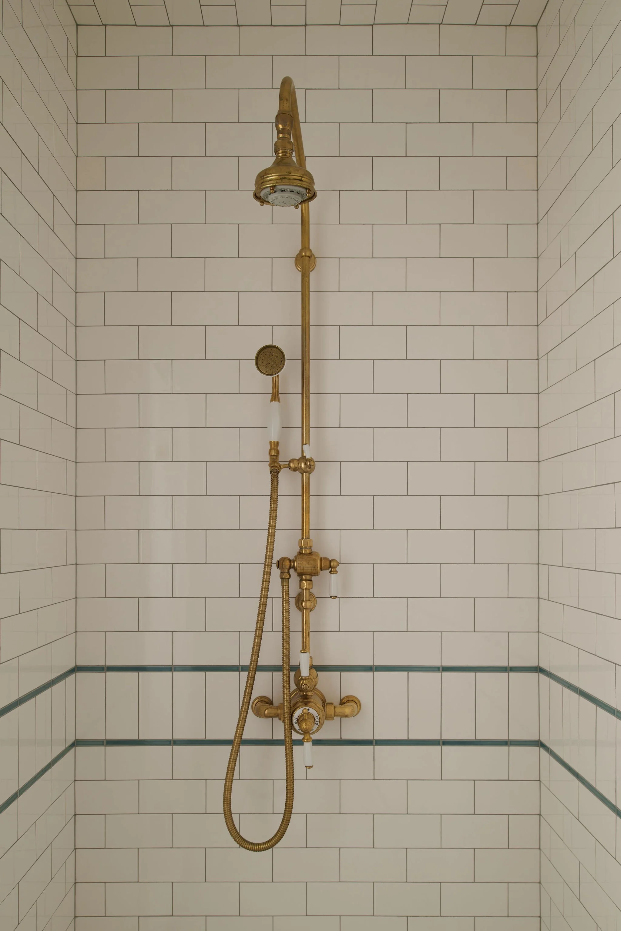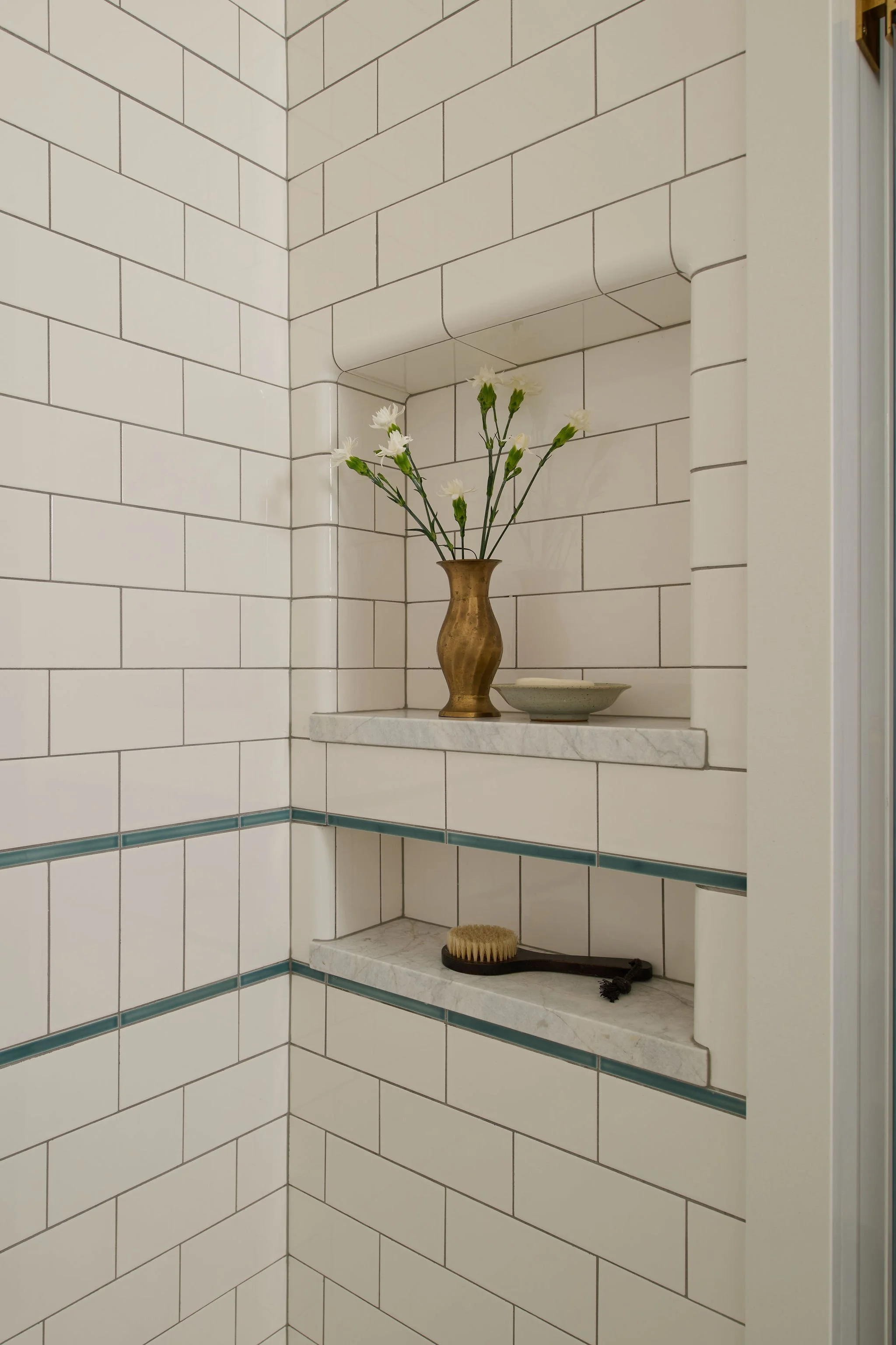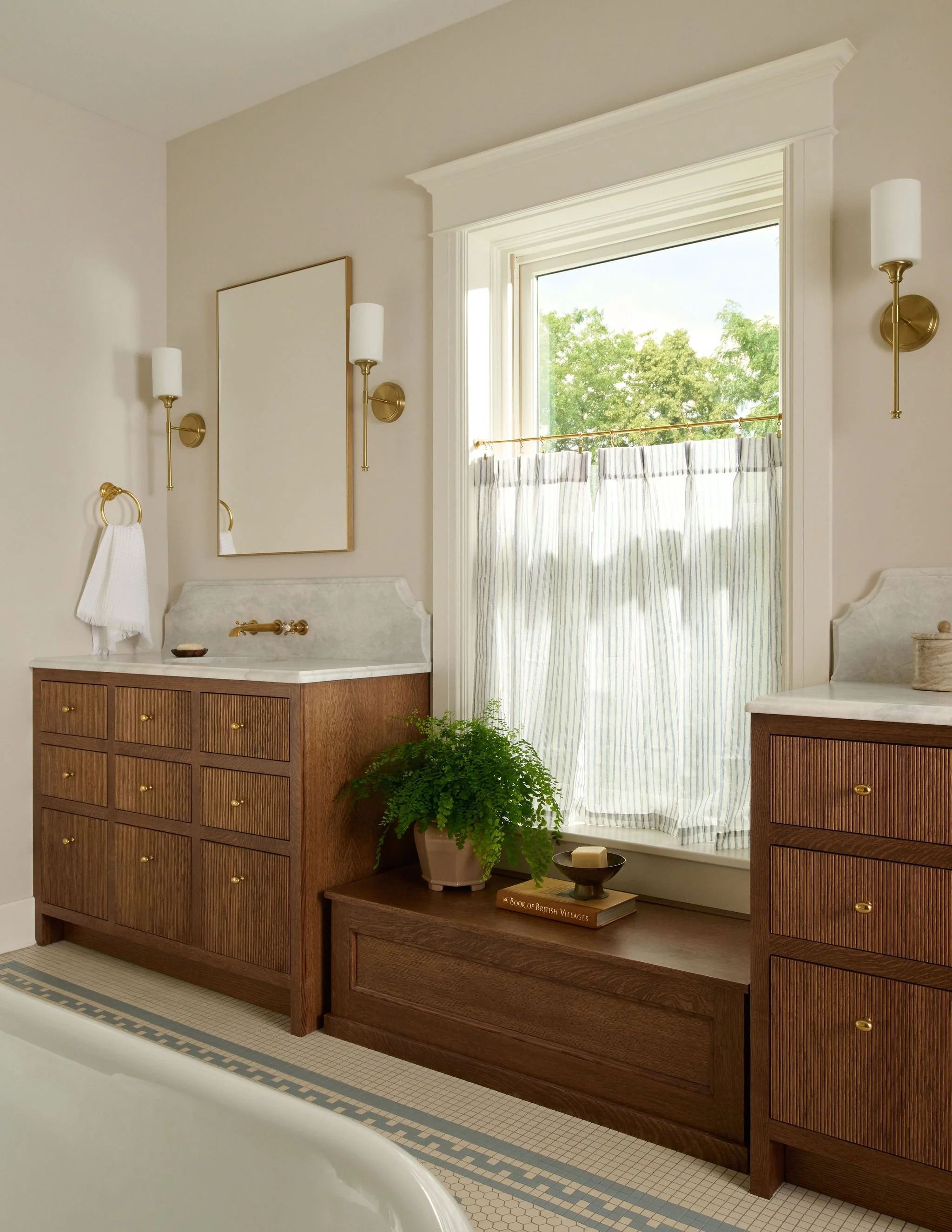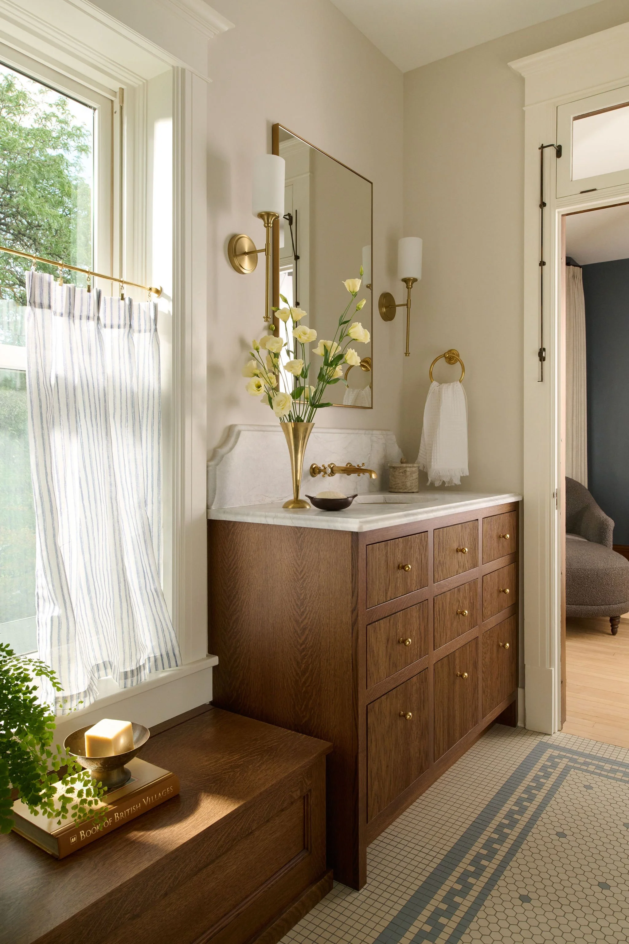 The main bathroom also received a complete transformation. The space was reconfigured to accommodate larger vanities and a free-standing soaking tub. To infuse the room with vintage charm, the design incorporated classic subway tiles, evoking a timeless aesthetic. A playful touch is added with a mosaic floor featuring a light blue border that wraps around the room. Unlacquered brass fixtures were selected to patina over time.